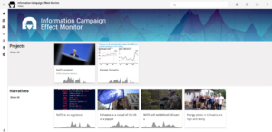 - Analitikų valdymo skydelis (GUI): Vartotojo sąsaja, leidžianti analitikams kurti ir valdyti projektus, sekti naratyvus, matyti informacijos klasterius (vektorių žemėlapius), laiko juostas, žodžių debesis bei žemėlapius.