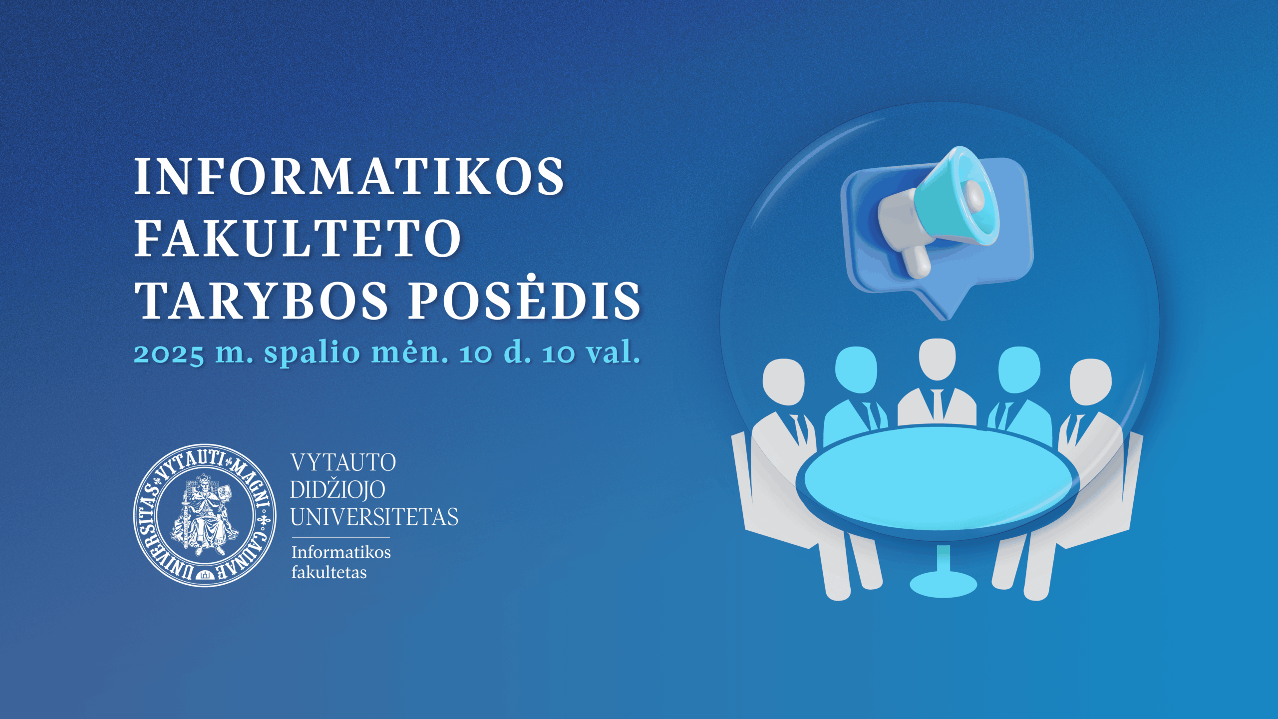 2025 m. spalio mėn. 10 d. 10 val. kviečiamas atviras Informatikos fakulteto tarybos posėdis. Darbotvarkė: Senato nario nuo Informatikos fakulteto rinkimai Informatikos fakulteto katedrų vedėjų rinkimai Vizituojančio profesoriaus statuso suteikimas Einamieji klausimai Posėdis ...